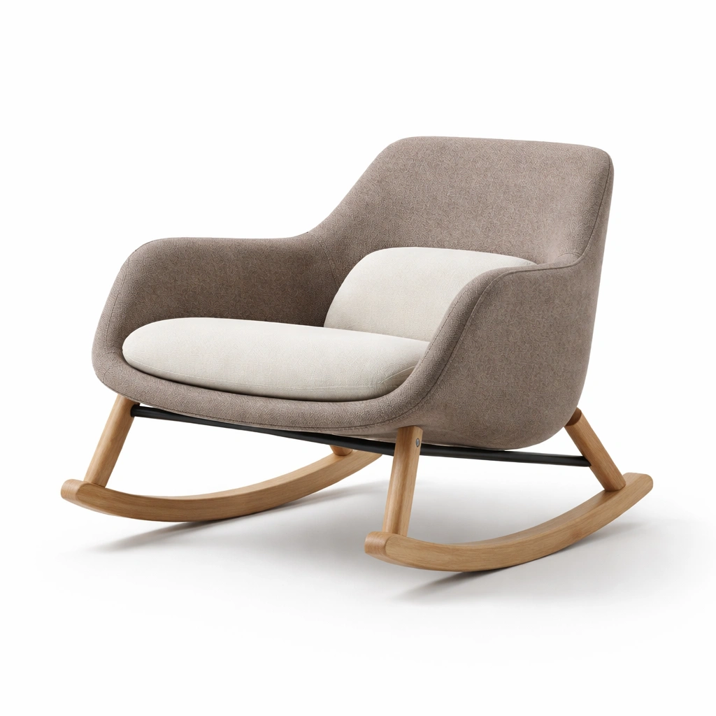 Der Schaukelstuhl verfügt über einen Bezug aus Polyestergewebe und ein Sitzkissen aus Polyurethanschaum. Die Kufen sind aus Eichenholz gefertigt und bieten Stabilität bei einem maximalen Gewicht von 120 kg.