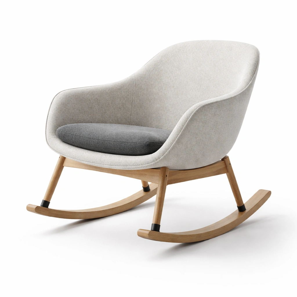 Dieser Schaukelstuhl verfügt über einen stabilen Rahmen aus massiver Eiche und eine Sitzfläche, die mit einem Polyestermischgewebe gepolstert ist. Die Kombination aus Beige und Grau verleiht ihm eine dezente Eleganz im Innenbereich.