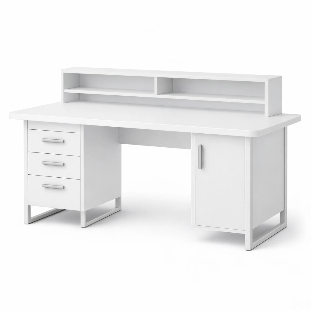Der Schreibtisch besteht aus MDF und Metall und bietet vielfältige Stauraummöglichkeiten. Er verfügt über drei Schubladen, eine Tür und zwei offene Fächer. Die Abmessungen betragen 150 cm in der Länge, 60 cm in der Breite und 75 cm in der Höhe.