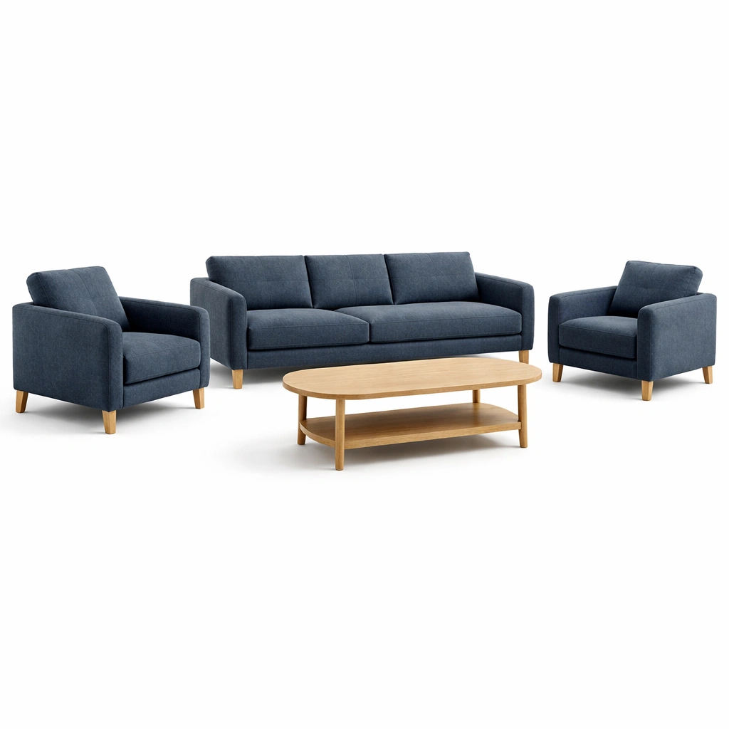 Dieses Set besteht aus einem 3-Sitzer Sofa, zwei Sesseln und einem Tisch.