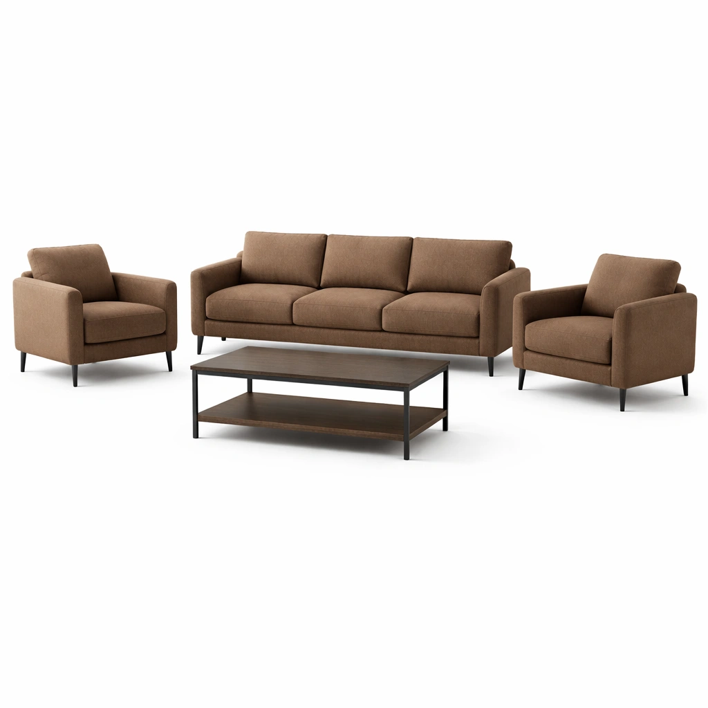 Das Wohnzimmer-Set besteht aus einem Dreisitzer-Sofa, zwei Einzelsesseln und einem Couchtisch.